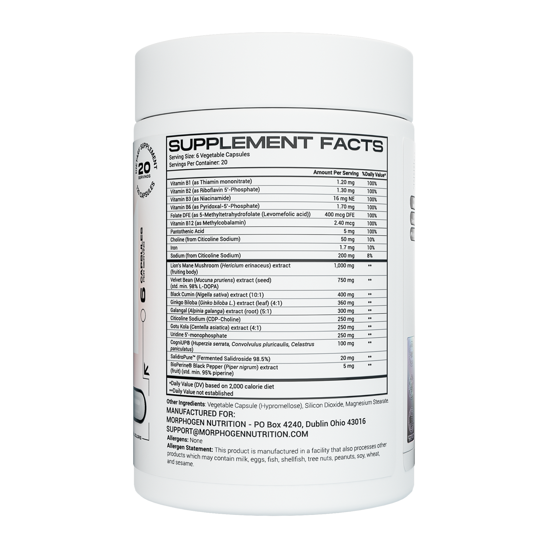 It combines a full spectrum of B-vitamins with clinically studied botanicals, nootropics, and adaptogens like Lion’s Mane, Mucuna, Ginkgo, Gotu Kola, and Salidroside, along with choline donors for neurotransmission and enzyme inhibitors for long lasting effects.